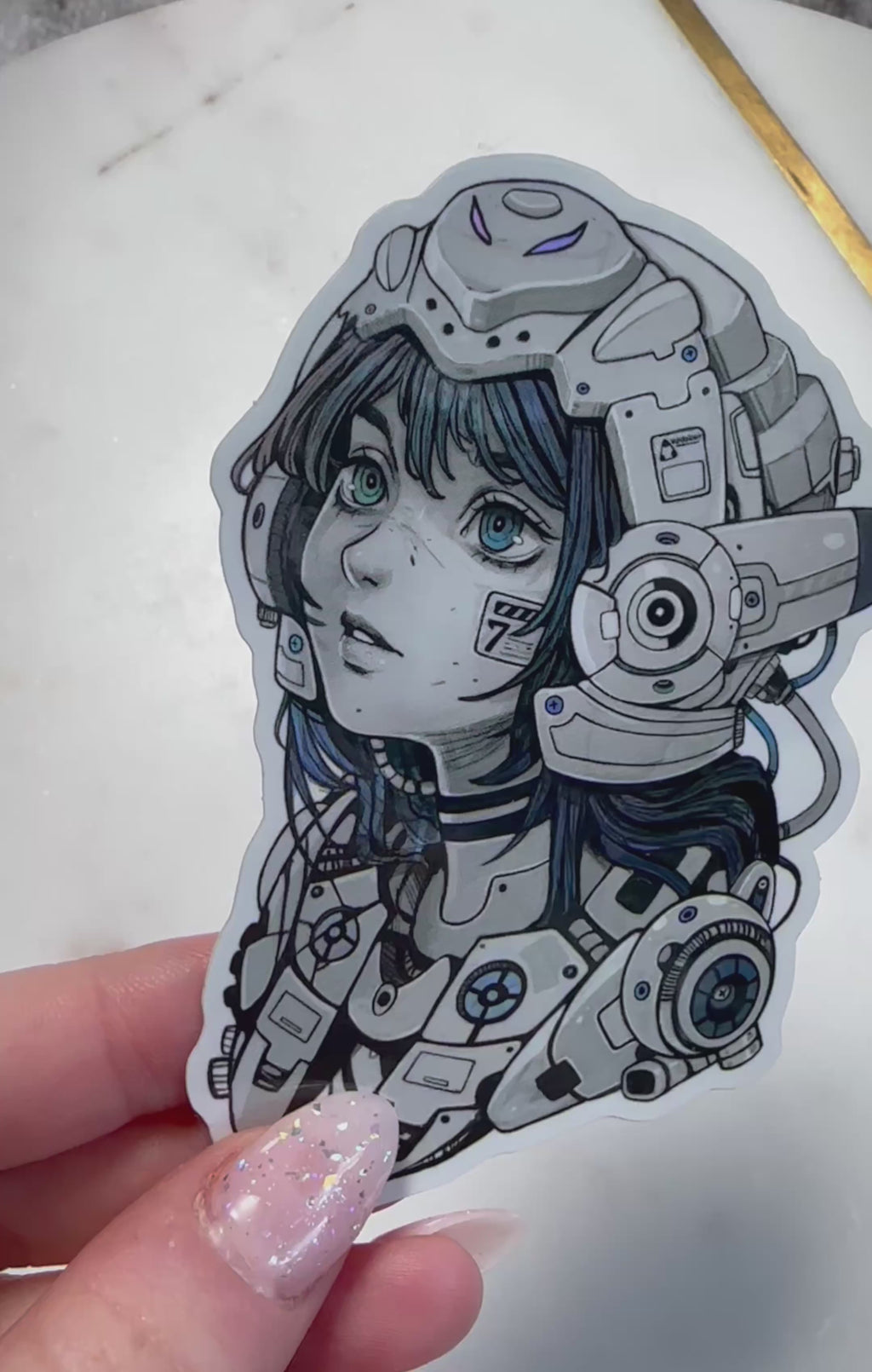 Holographic Space Helm sticker measuring 3.5 inches tall with holographic details. Sticker is made with durable vinyl that is weather / fade proof and can be placed on water bottles, cars, laptops etc.